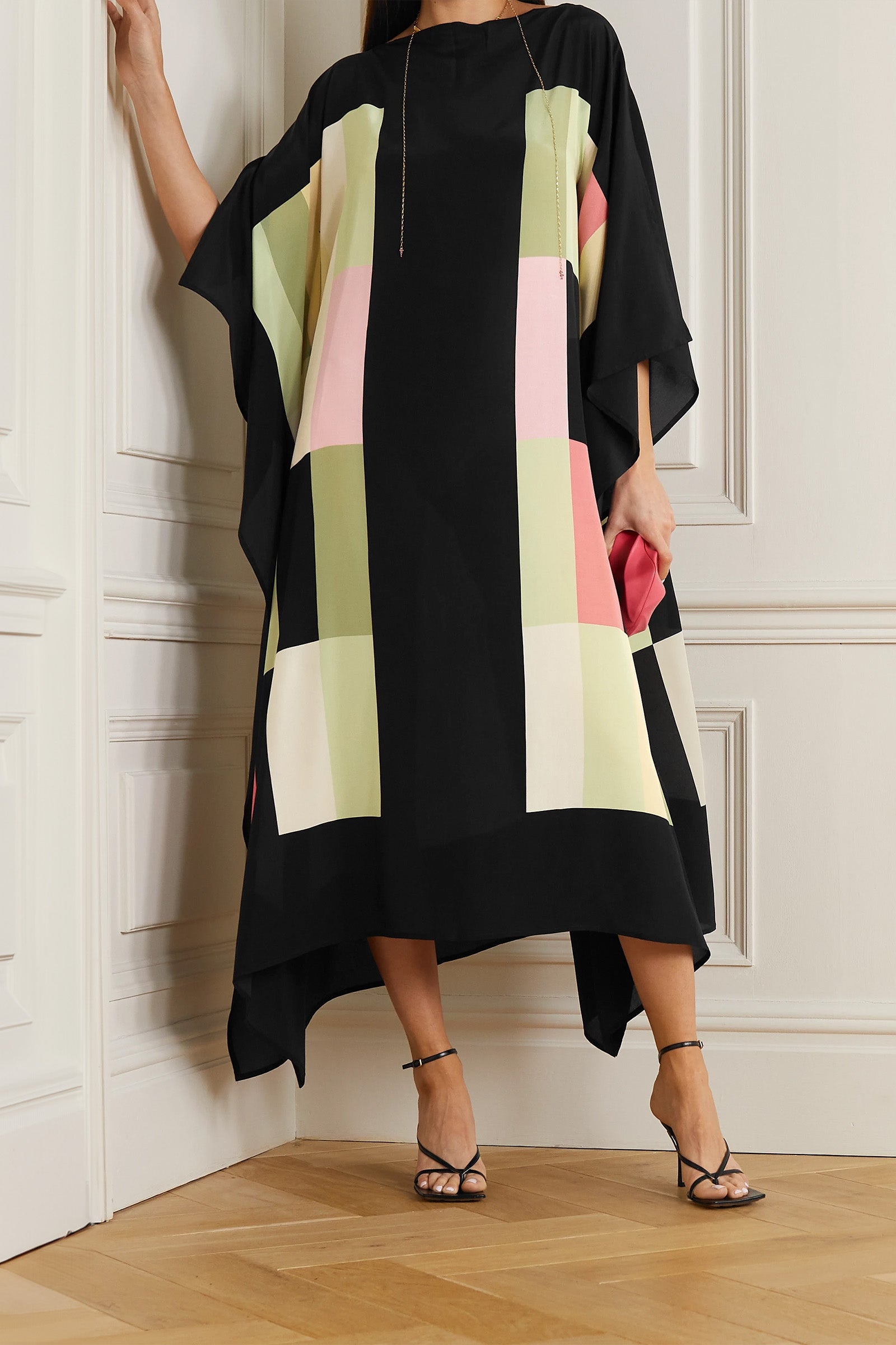 This multi-colour kaftan in satin silk is graceful and stylish, enhanced in its elegance with the boat neck, it can be paired with a baguette bag or a shoulder tote.